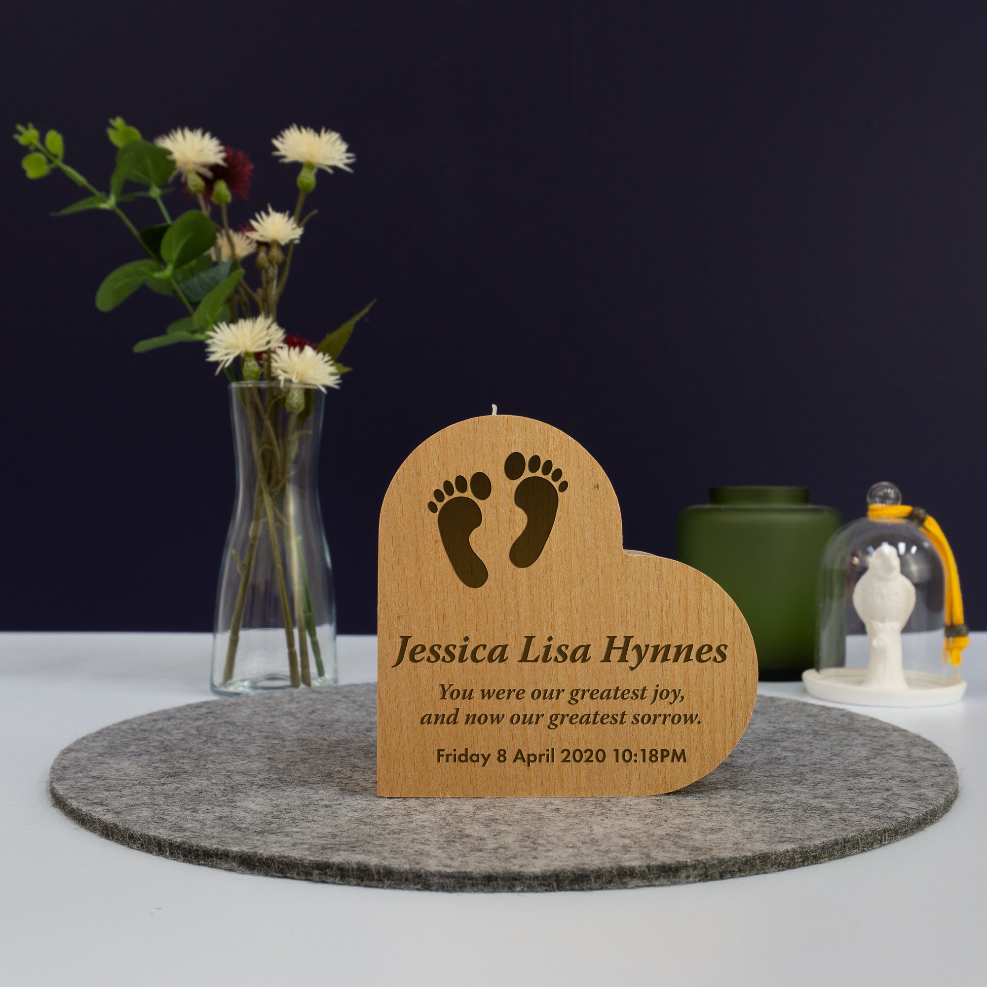 This Baby infant loss memorial heart shaped candle holder is made from solid beech wood and is unvarnished but sanded down to a smooth finish. The heart shaped tea light holder features a pair of baby feet which are laser engraved into the wood. It can be personalised with a name, a date and time along with a short eulogy. The hole for the tea light candle has a diameter of 41mm and a depth of 13mm and will accommodate a regular size tea light candle.