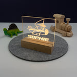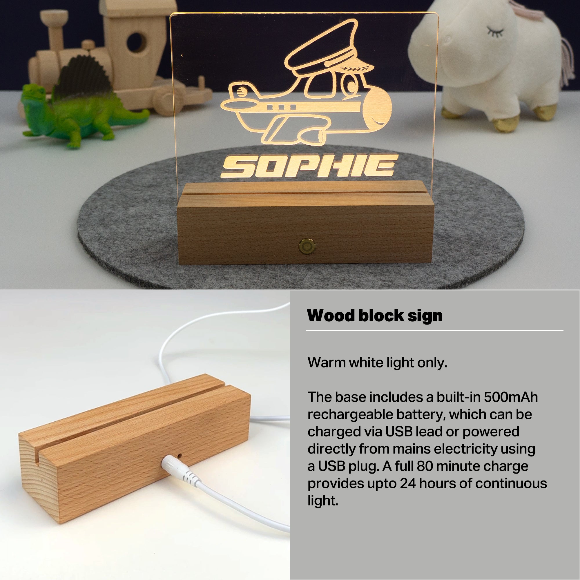 This custom child's bedroom name plaque features a jet airplane illustration and can be personalised with a first name. The artwork is laser engraved on to a clear acrylic slide which slots into a birch wood base. A series of LED lights in the bottom of the wooden base illuminate the slide giving a warm white glow and the brightness is dimmable making it an alternative to a traditional night light. The wooden base will sit comfortably on a flat surface, shelf or table top.