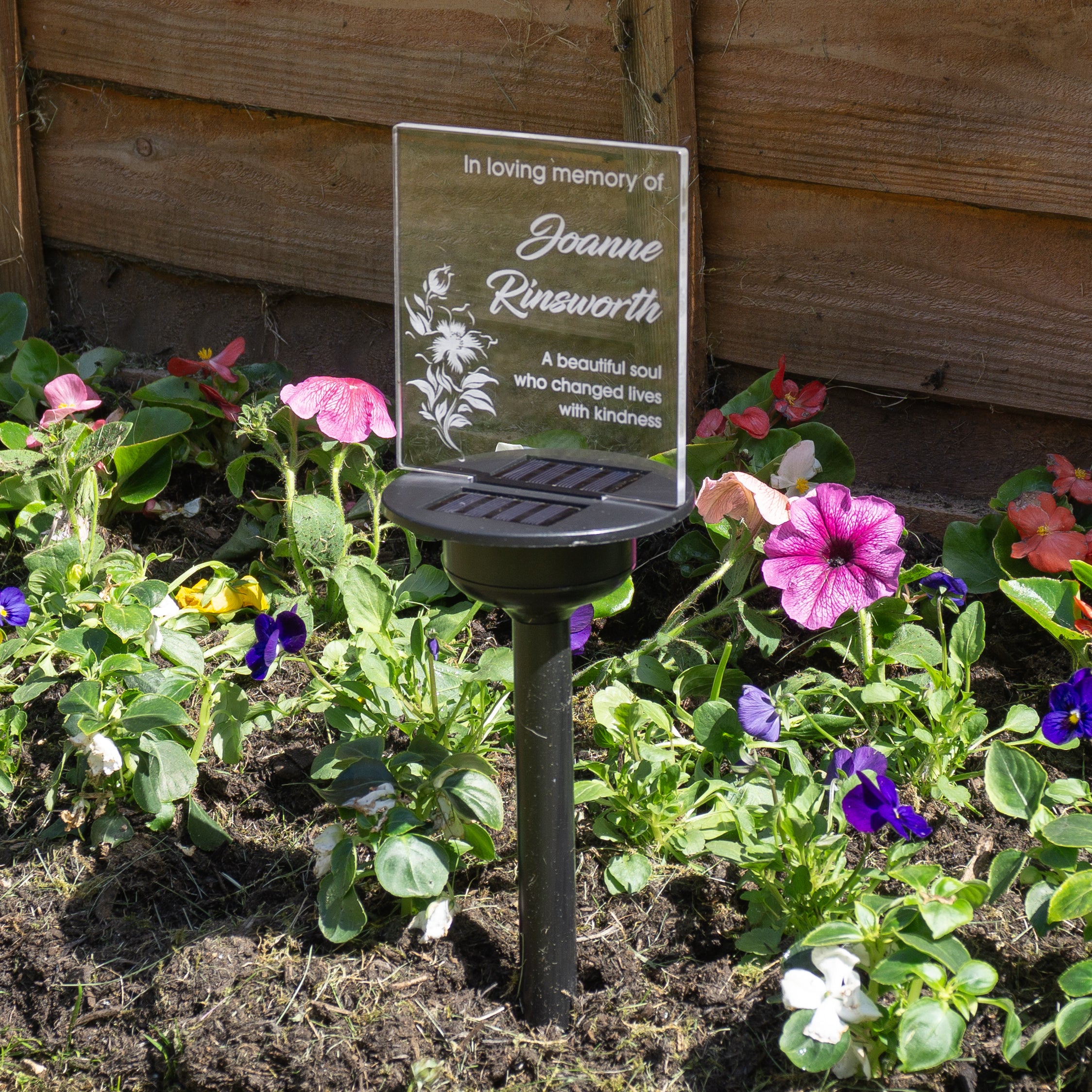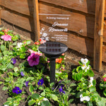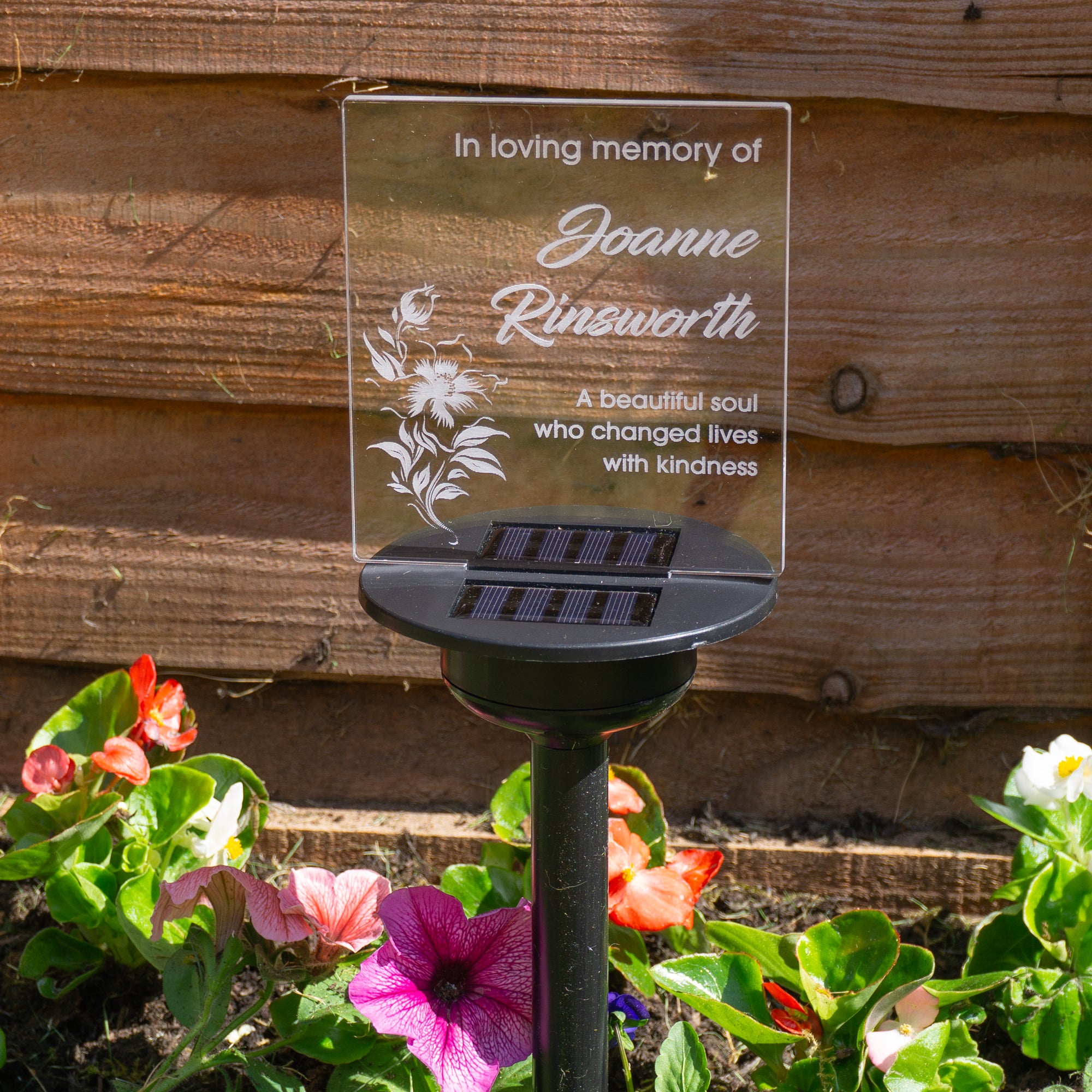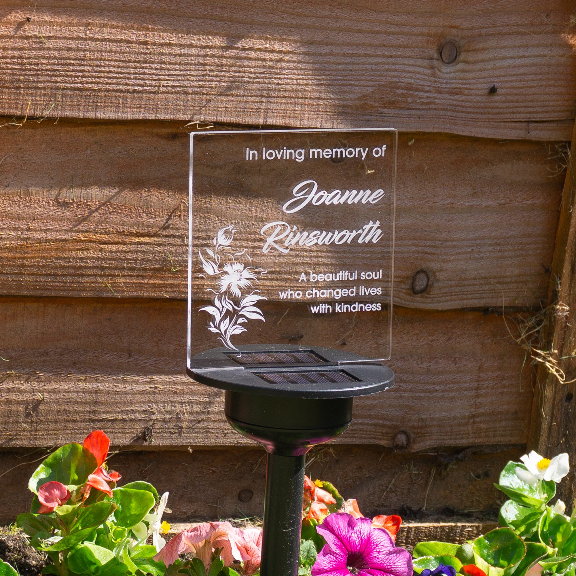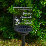 Floral sympathy gift custom made grave marker. Personalised solar powered light up LED sign. Memorial garden graveside name plaque