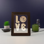 This funny framed artwork LED sign features the word LOVE with a mirror disco ball graphic.