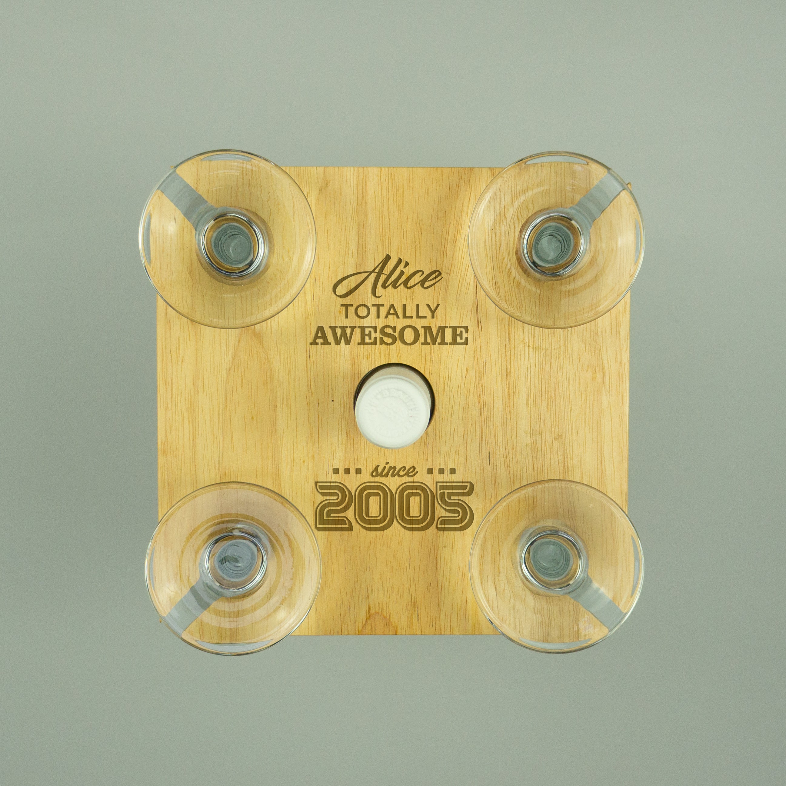 This personalised 20th Birthday present custom engraved quad wine glasses bottle tray holder makes the ideal gift for any wine love. The tray can be personalised with the recipient's name.Made from 15mm Hevea wood the holder can carry four wine glasses or Champagne flutes along with your favourite bottle of wine.