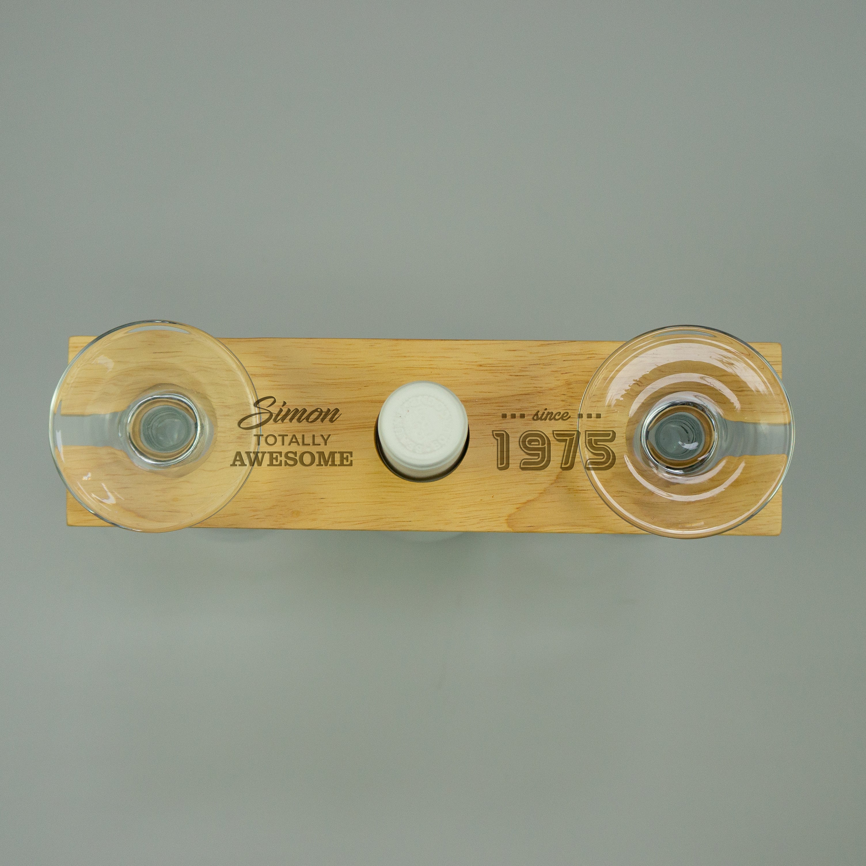 This personalised 50th Birthday present Gift for wine lover is a Custom engraved twin glasses bottle tray, which can be personalised with the recipient's name. Made from 15mm Hevea wood the holder can carry two wine glasses or Champagne flutes along with your favourite bottle of wine.