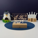 This personalised boy's LED name plaque features a space man illustration with the line 'Dream Big Little..." which can be personalised with a first name. The artwork is laser engraved on to a clear acrylic slide which slots into a birch wood base. A series of LED lights in the bottom of the wooden base illuminate the slide giving a warm white glow and the brightness is dimmable making it an alternative to a traditional night light. The wooden base will sit comfortably on a flat surface, shelf or table top.