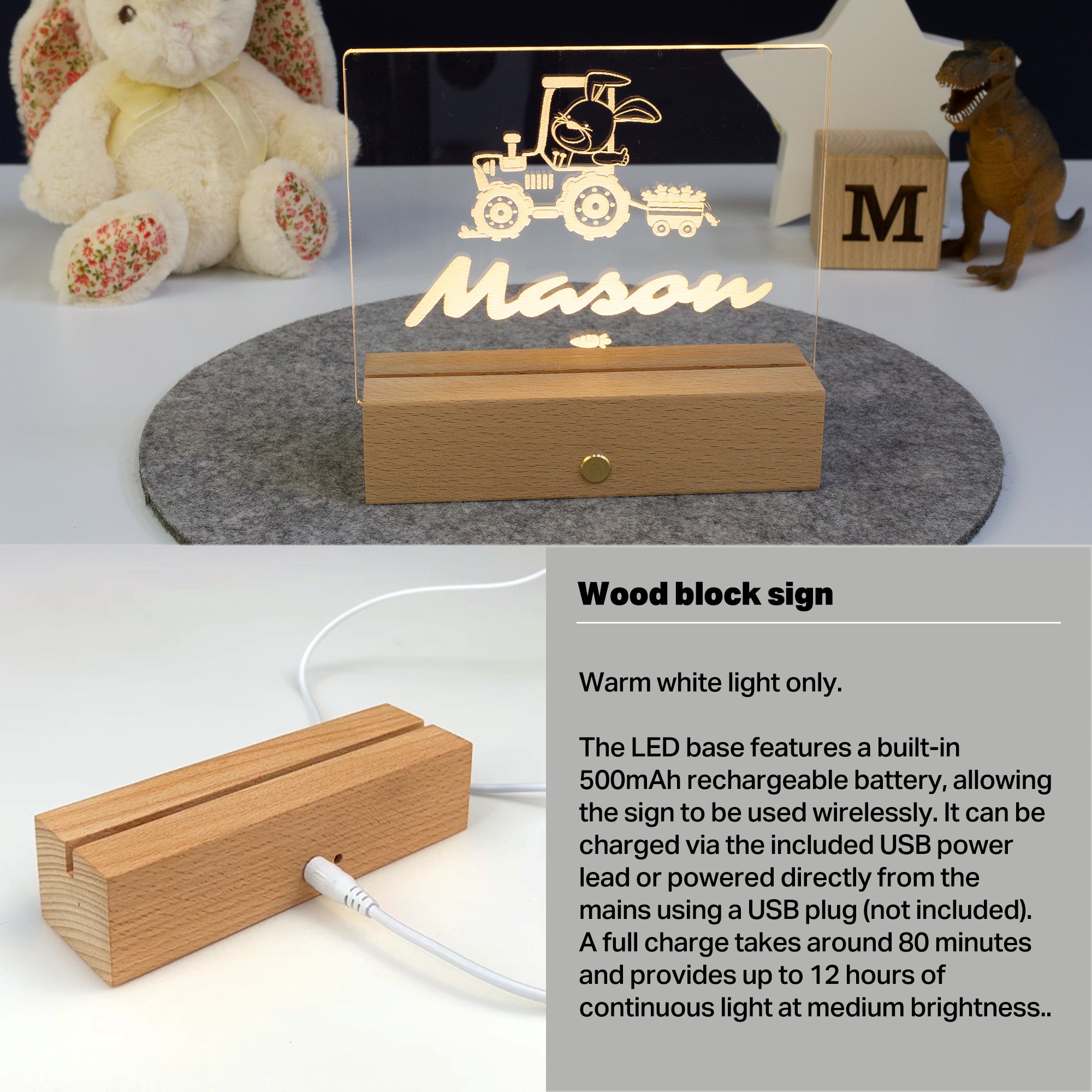 This LED light up name plaque, rechargeable neon sign acn be personalised with a child's first name and features a rabbit and tractor illustration. The artwork is laser engraved on to a clear acrylic slide which slots into a birch wood base. A series of LED lights in the bottom of the wooden base illuminate the slide giving a warm white glow and the brightness is dimmable making it an alternative to a traditional night light. The wooden base will sit comfortably on a flat surface, shelf or table top.