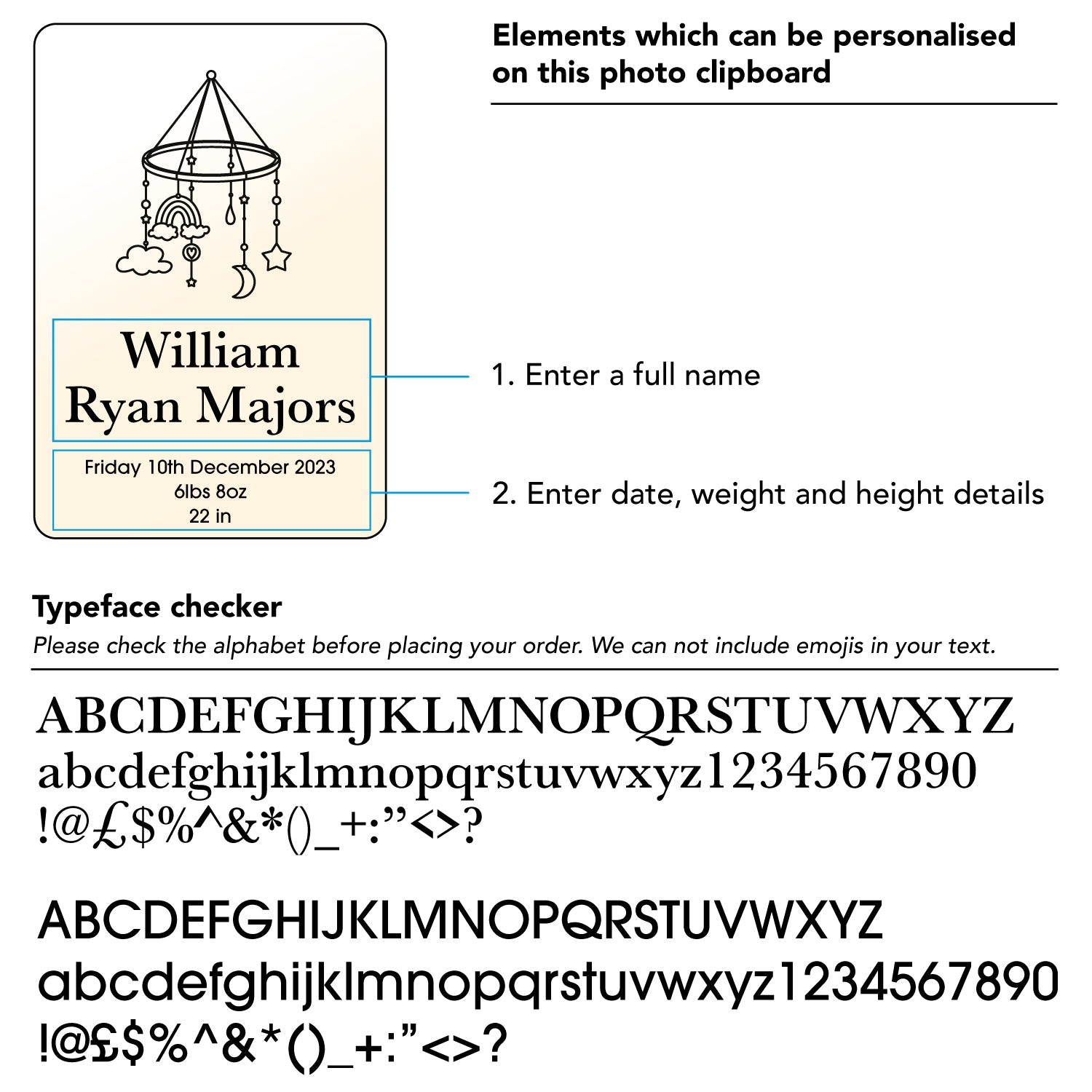 Please refer to the 3rd slide in the photo gallery to view the typefaces used on the photo clipboard and which elements of the photo clipboard display can be personalised.