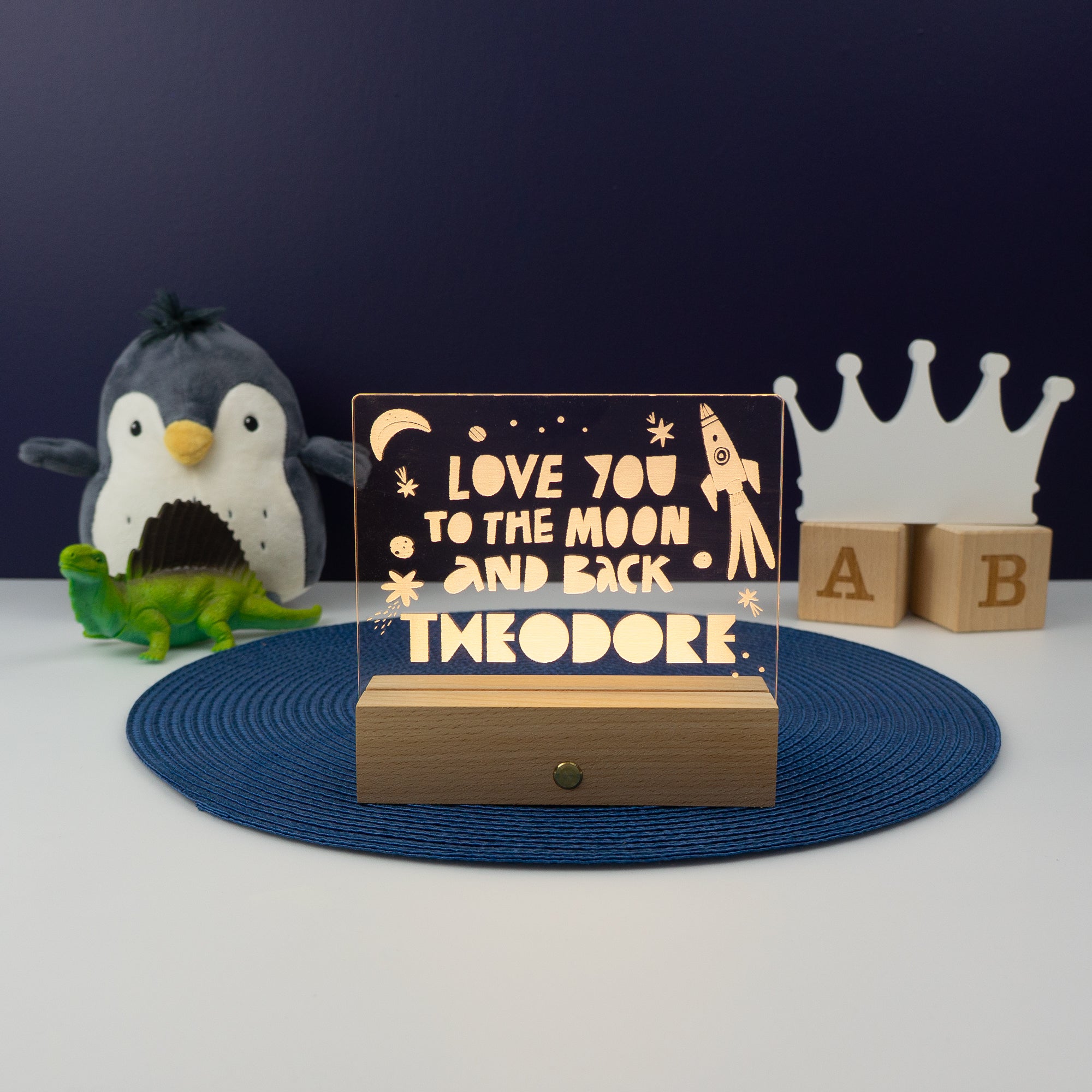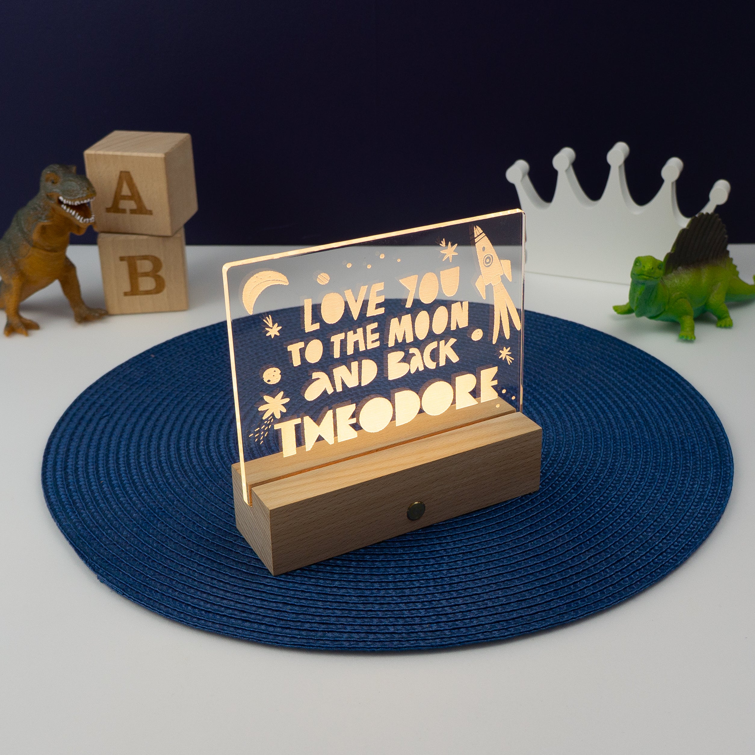 This personalised night light is a custom LED bedroom name plaque which features the phrase 'love you to the moon and back' and can be personalised with a child's first name. The artwork is laser engraved on to a clear acrylic slide which slots into a birch wood base. A series of LED lights in the bottom of the wooden base illuminate the slide giving a warm white glow and the brightness is dimmable making it an alternative to a traditional night light. The wooden base will sit comfortably on a flat surface, shelf or table top.