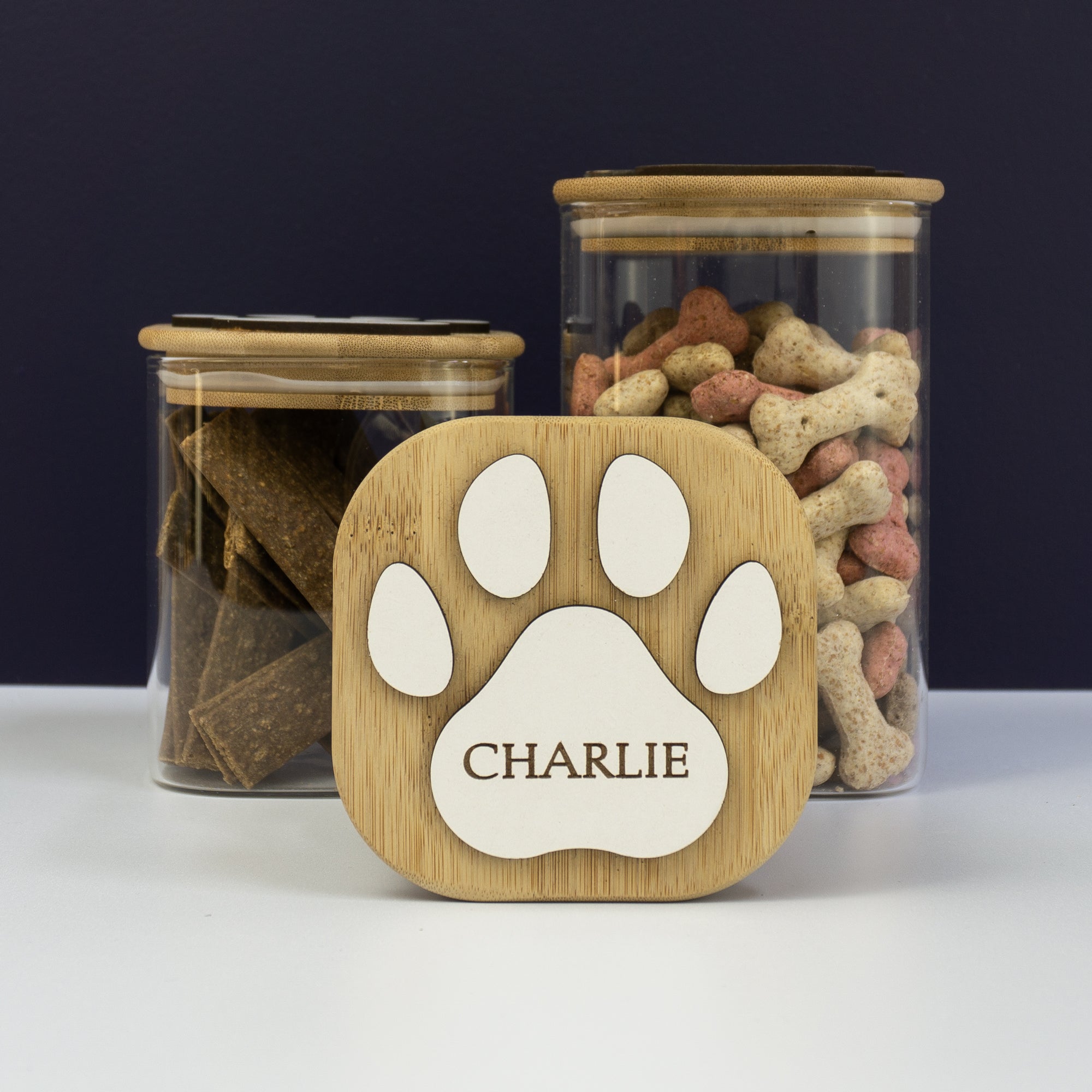 These borosilicate glass jars are the ultimate pet dog or cat treat containers, available in four convenient sizes. Each jar is topped with a bamboo lid, featuring a white wood paw print that can be custom engraved with your pet's name. The silicone seal ensures your pet's treats or food stay fresh for longer. These jars are a truly perfect gift for any pet owner.