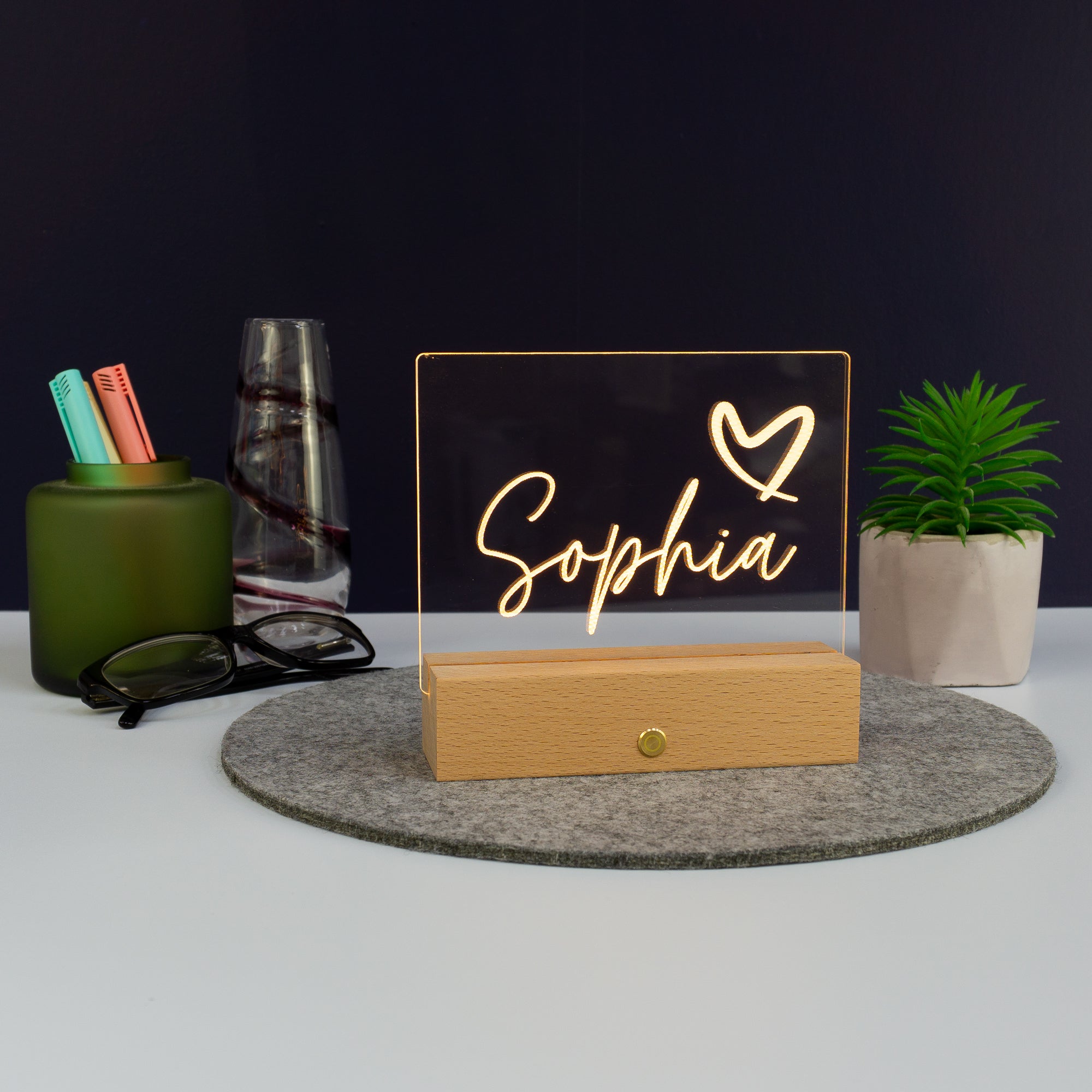 This personalised LED name sign features a love heart illustration and can be custom engraved with a first name. The artwork is laser engraved on to a clear acrylic slide which slots into a birch wood base. A series of LED lights in the bottom of the wooden base illuminate the slide giving a warm white glow and the brightness is dimmable making it an alternative to a traditional night light. The wooden base will sit comfortably on a flat surface, shelf or table top.