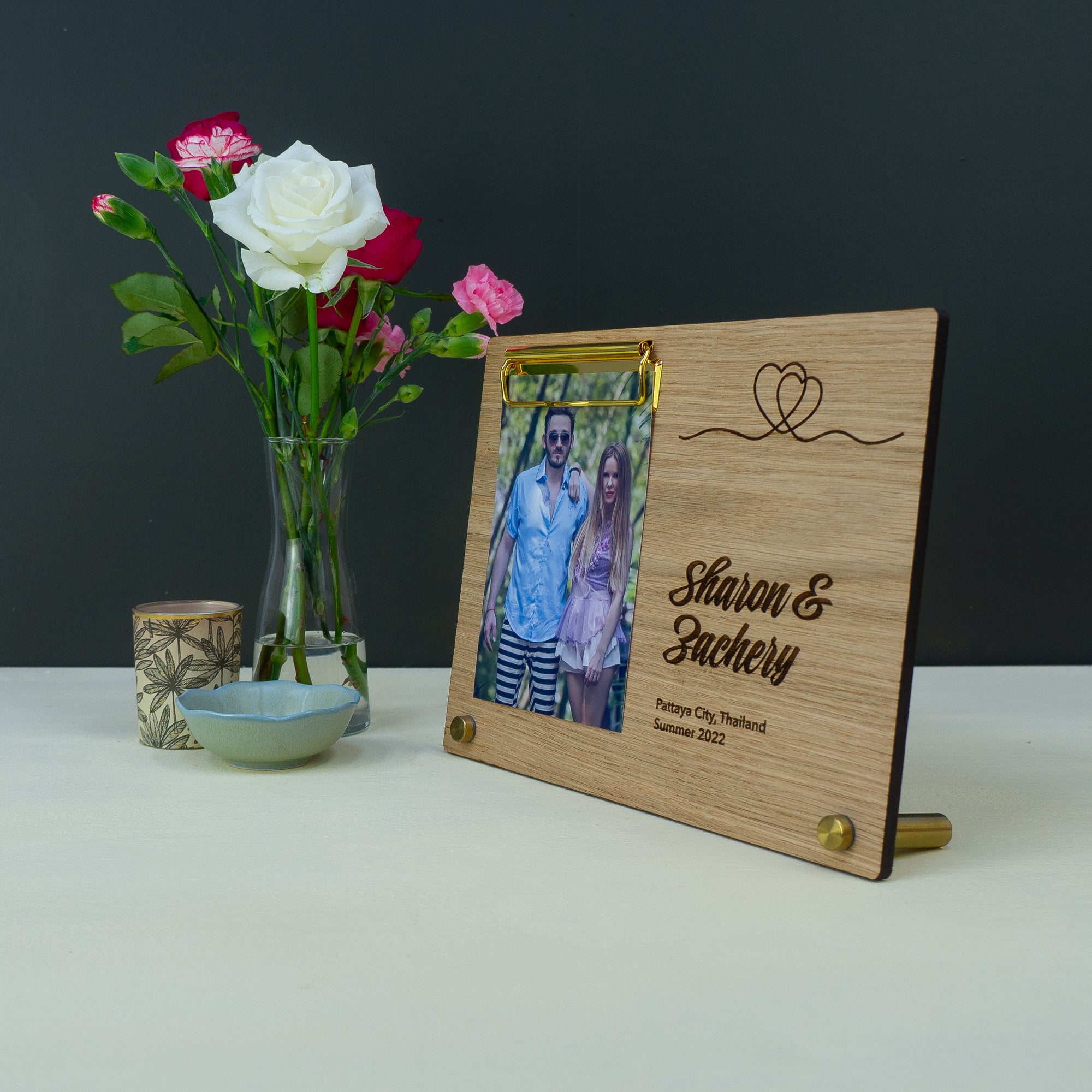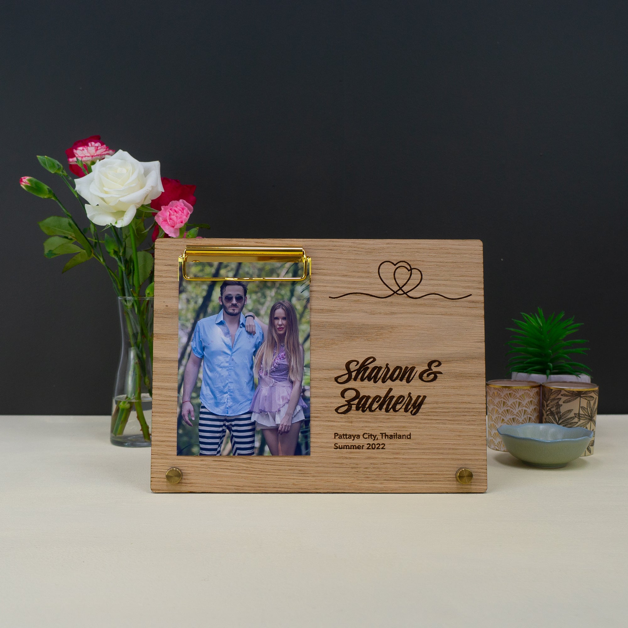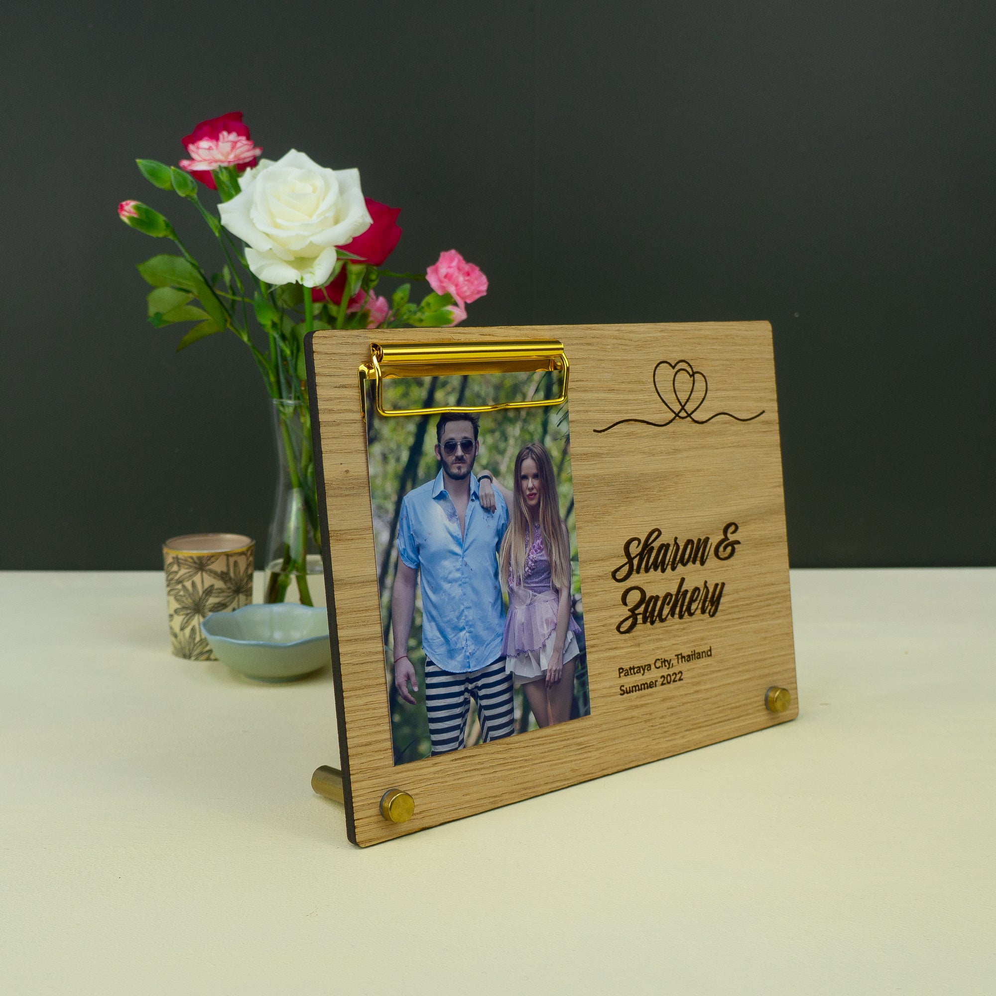 This photo gift idea for couples is a unique and original way to display a photograph of a couple or newlyweds. The large wooden board is laser engraved with a couple's first names and can be customised further with 2 additional lines of text. It features a gold coloured clipboard like clip which securely holds a regular 4' x 6' portrait photo print. The custom engraved photo clipboard frame is freestanding and has 2 metal pegs in the bottom corners.
