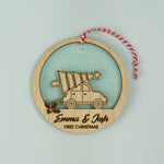 This custom made Christmas tree decoration is made up from a layer of cherry MDF wood and a back plate of frosted acrylic and is ready to hang with a length of cotton twine. This Xmas bauble features a wooden cut out illustration of a car and Christmas tree and etched onto the back frosted acrylic is a night sky. The Christmas ornament can be personalised with up to 2 first names with the line 'First Christmas'.